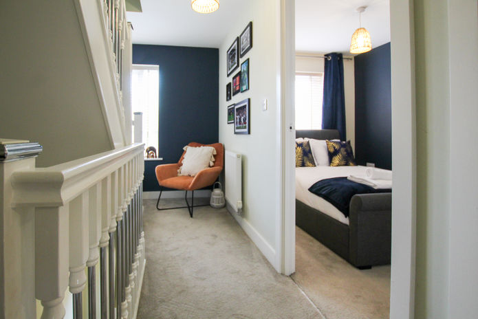 First floor a beautiful lounge with sofa bed, first of the double bedrooms and a workspace with desk.